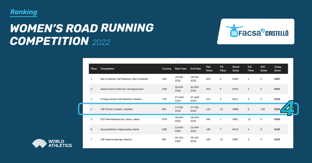 La 10K FACSA Castelló cumple 10 ediciones este año y lo hace desde lo más alto. La carrera se sitúa en los primeros puestos del ranking mundial que elabora World Athletics, el órgano de gobierno del atletismo internacional. En el ranking global, en el que se tienen en cuenta tanto categoría masculina como la femenina, la competición castellonense ocupa un sexto puesto, pero escala hasta la cuarta posición mundial en la competición femenina. Esta última se posiciona como la competición española más importante y, en la clasificación global, 10K FACSA Castelló adelanta a las carreras más prestigiosas y reconocidas del mundo.