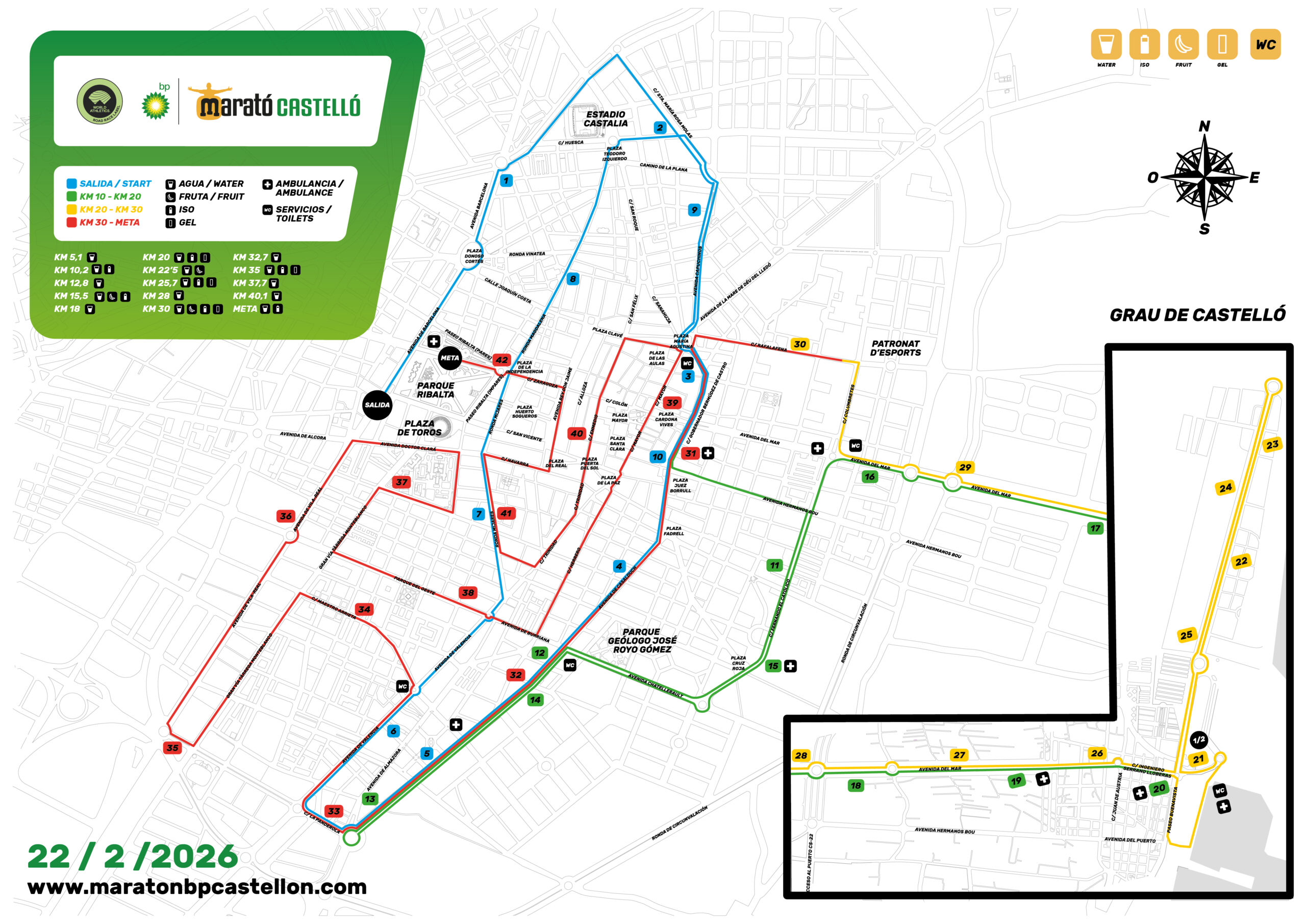 Es una de las maratones más rápidas de España. Un circuito que se inicia en la avenida Vila-real (frente a El Corte Inglés) y que también discurre por el distrito marítimo del Grao de Castelló, permitiendo correr con vistas al mar.